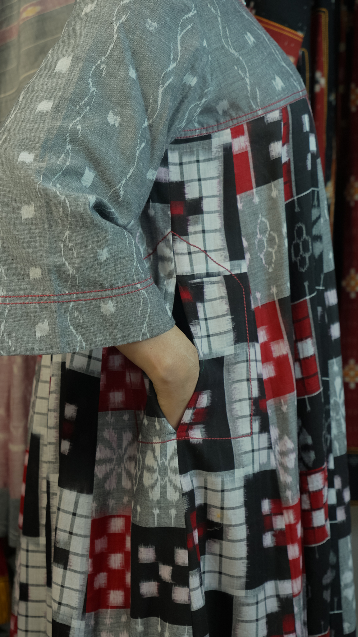 Monochrome Mosaic: Ikat thread work Jacket Dress with Tribal Panels in Grey, Red & Black