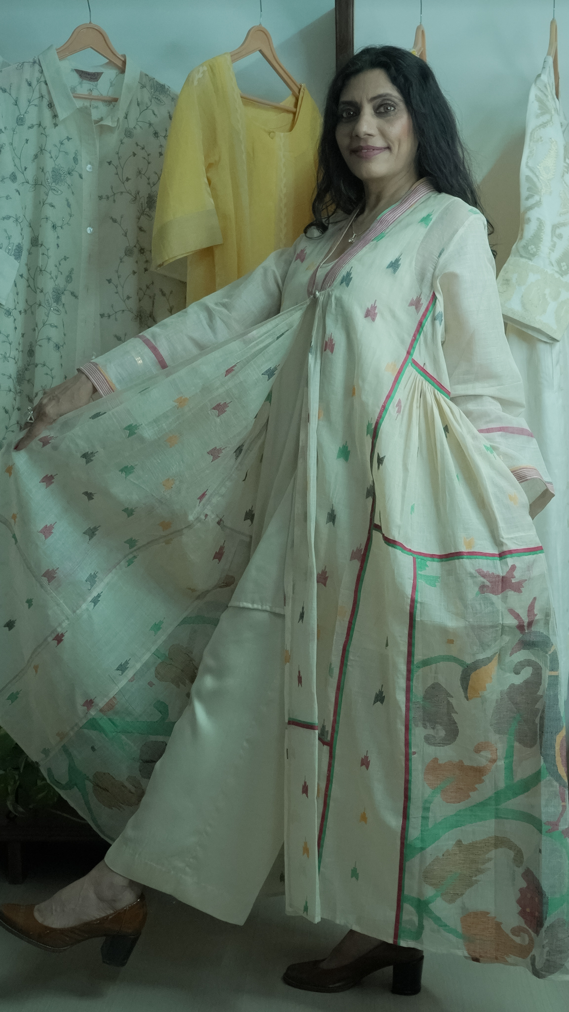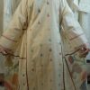 Handwoven beige authentic jamdani fabric with peackcock motifs paired with modale satin top and pants ( 3 piece set)