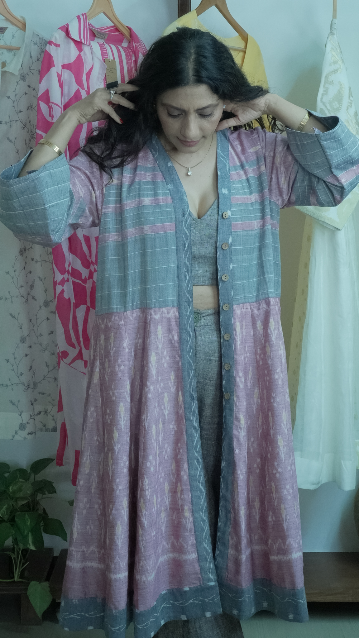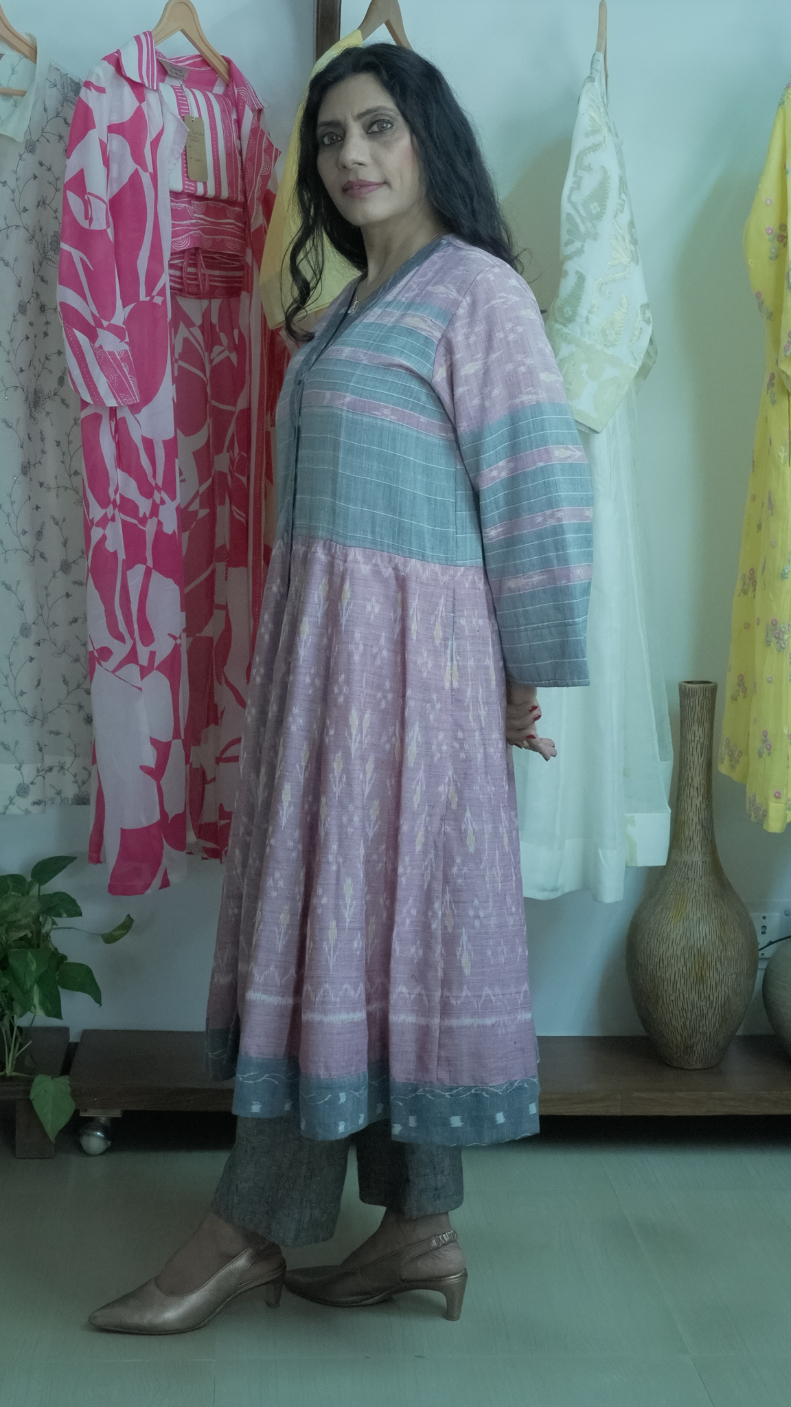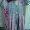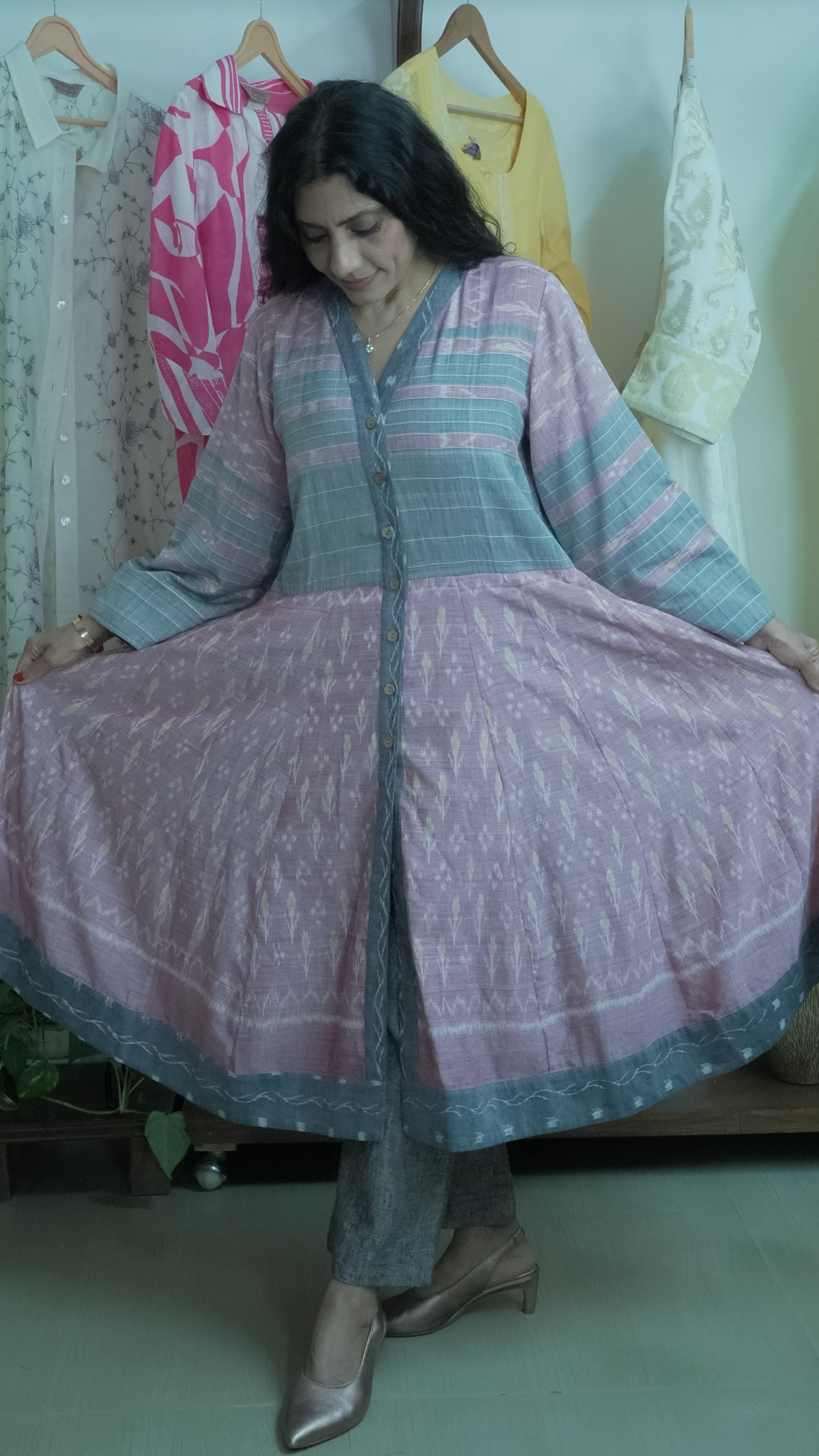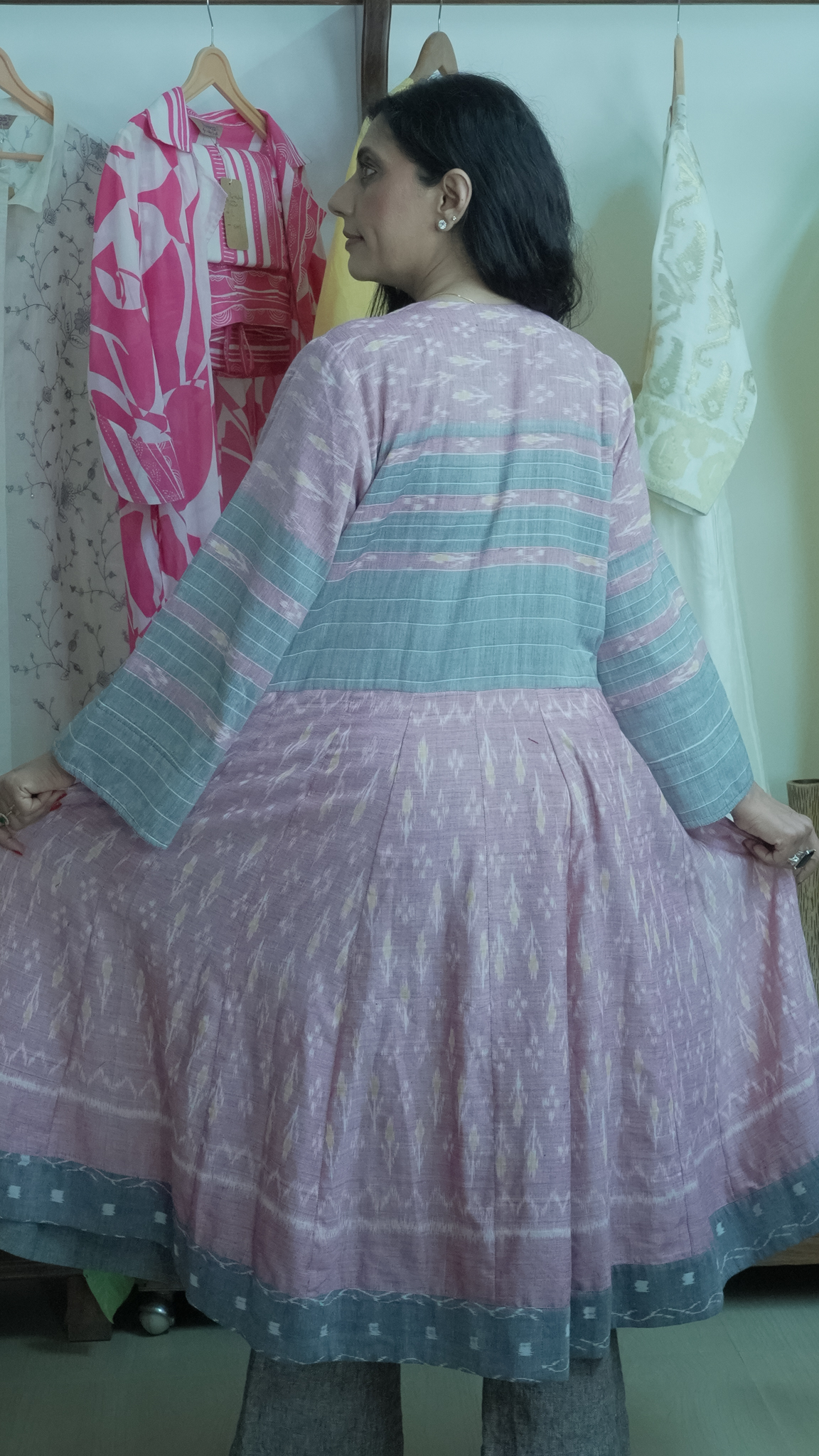 Pastel Mirage: Flared Tunic Dress – Kurti in Pink, grey & White handwoven Ikat Patterns